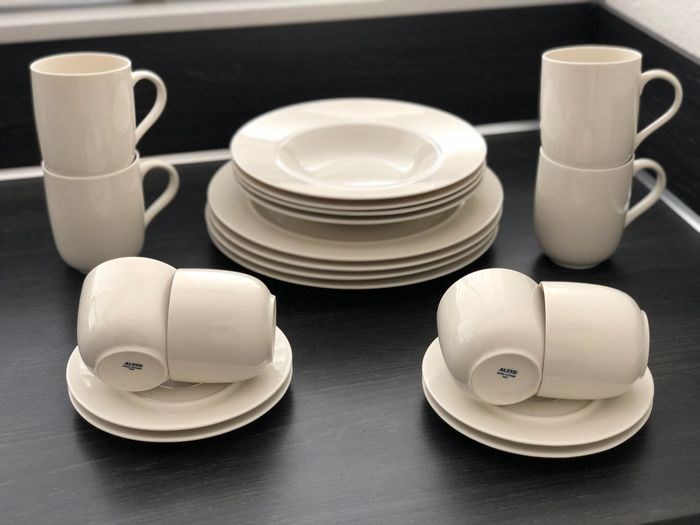 Elegante luxe set van Alessi uit de serie La Bella Tavola. Ontworpen door Ettore Sottsass in 1993. De collectie is tijdloos en van hoogwaardige kwaliteit. Ze zijn gemaakt van porselein met een glanzende afwerking en zorgen voor een klassieke verfijnde maaltijd op tafel. Zowel magnetron- als vaatwasserbestendig.