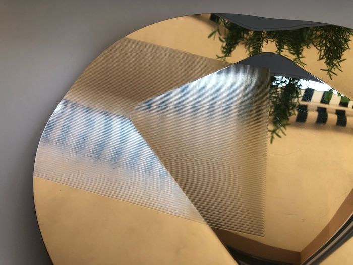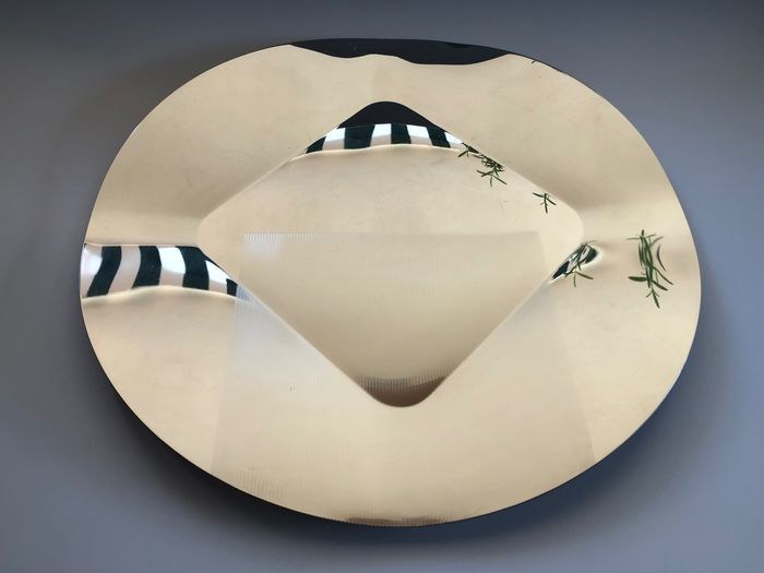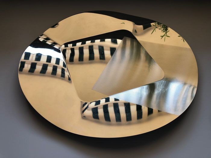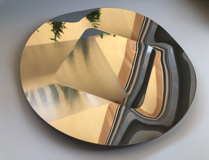 Het heeft een onderscheidende vorm die wordt gekenmerkt door verschillende vouwen in het metaal, met de toevoeging van een gesegmenteerde textuur die het staal een aangetaste uitstraling geeft. Uit de eerste collectie geproduceerd door Alessi.