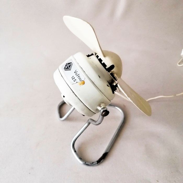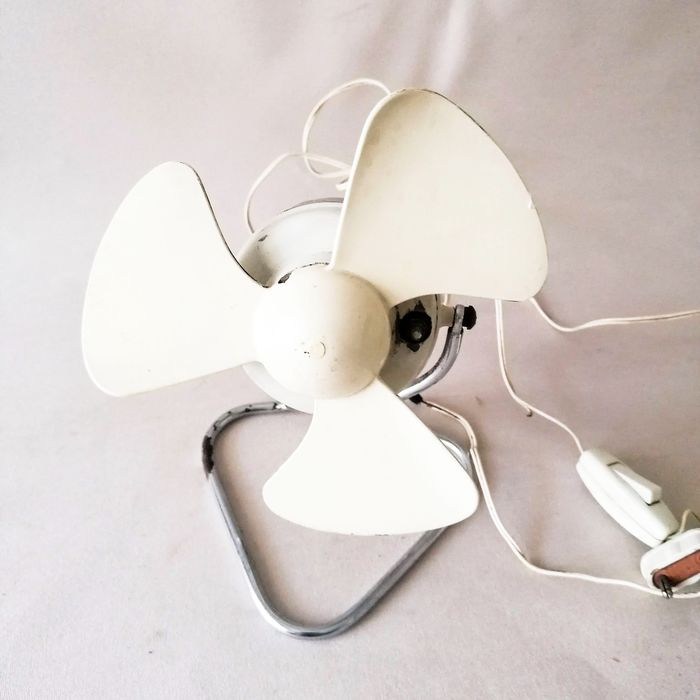 Het metalen deel van de ventilator is wit gelakt en de steun is gemaakt van verchroomd ijzer.