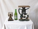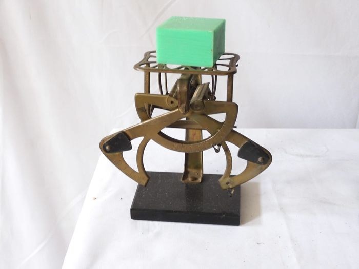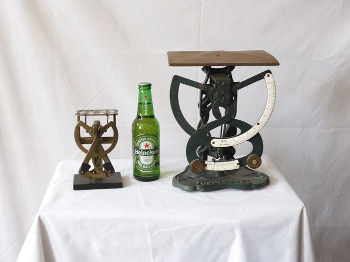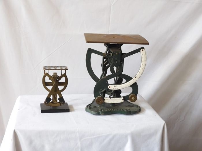 de grootste weegschaal is gemaakt van ijzer / gietijzer, de kleinste van Koper met een natuurstenen plaatje