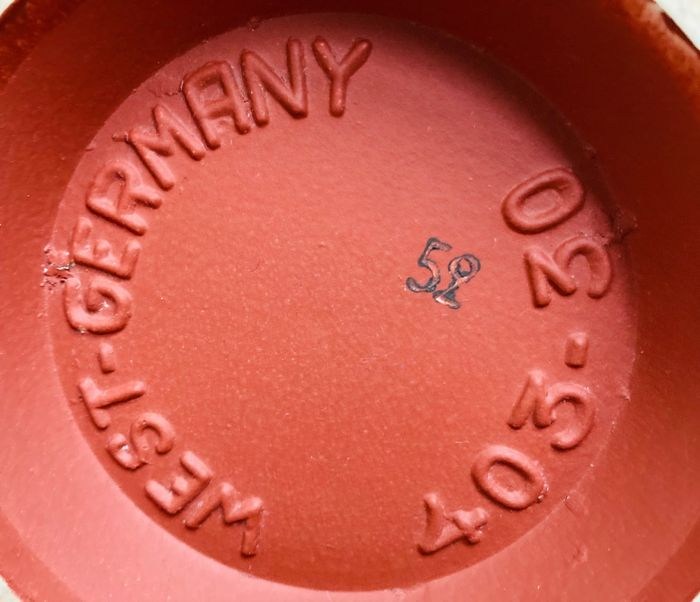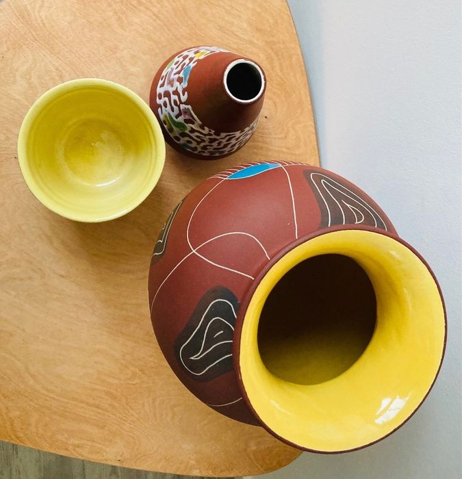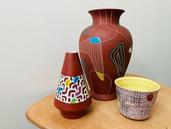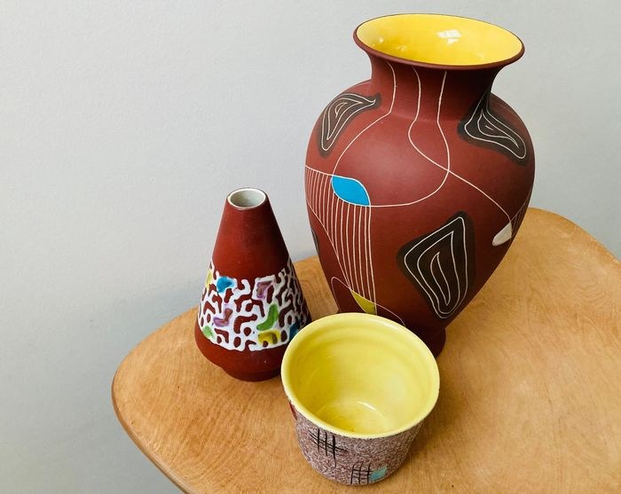 Drie stukken ‘mid-century modern’ keramiek van de grote Duitse manufacturen Bay Keramik en Scheurich (West-Germany, West-German pottery, WGP). Een grote vaas in decor ‘Brasil’, ontwerp van Bodo Mans voor Bay Keramik, hier met vormnummer 403-30 dus ongeveer 30 cm hoog; een buitengewoon zeldzame pyramide-vaas van Bay Keramik met vormnummer 1063-20 dus ongeveer 20 cm hoog; een bloempotje van Scheurich zonder vormnummer (maar het decor is bekend van vazen; een rest van het oorspronkelijk label is onleesbaar) met modernistisch patroon en typisch geel glazuur binnenin. De drie stukken zijn in goede staat met normale gebruikssporen gezien de ouderdom. De grote vaas heeft drie chipjes aan de binnenzijde van de standring (en dus volstrekt onzichtbaar bij normale plaatsing), zoals zichtbaar is op de foto’s.
