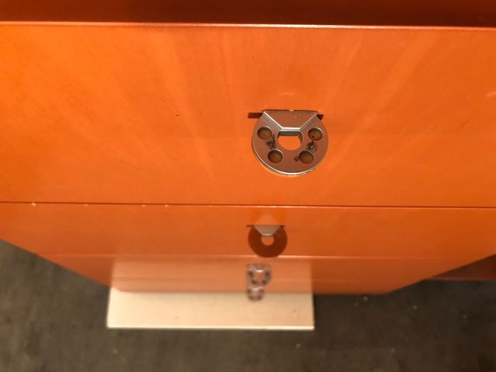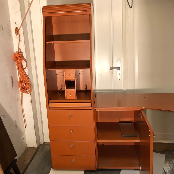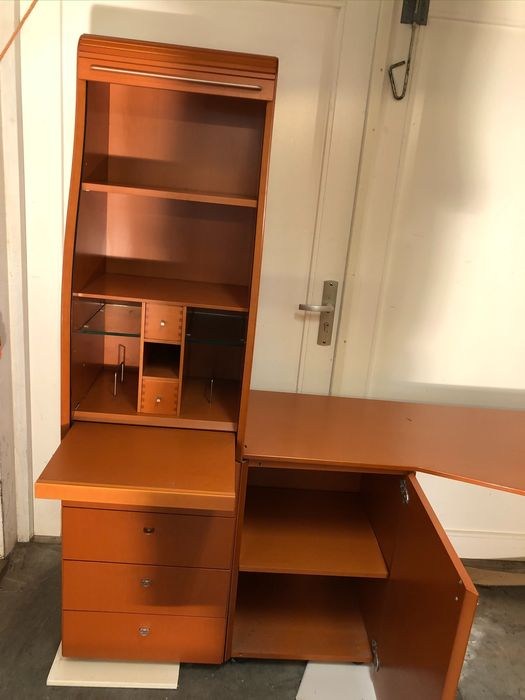 Dit bureau + kastjes van het merk Interlubke werd gekocht in 2001 bij het toenmalige DINTRA in Alkmaar. Er zit een klein brandplekje in nog daterend uit de tijd dat er in huis gerookt werd.Verder is de gehele set in onberispelijke staat.De hoogte van de kast is 174 cm, breedte is 48. De diepte van het bureaublad varieert van 86 tot 48. De totale breedte van het bureaublad is 168. Het 'schuine' deel is 113 breed.De nieuwprijs was 9447 gulden.