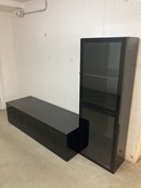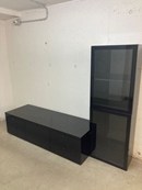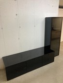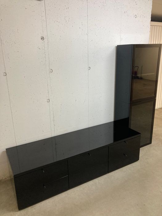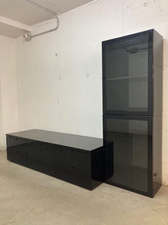 Schitterende Lowboard en Highboard ontworpen door Angelo Mangiarotti voor 'La Sorgente Dei Mobili' in 1977. De kast is gemaakt van gepolijst zwart gelakt hout. In het dressoir zijn twee glasplaten zichtbaar. De materialen zijn prima, zoals te zien is aan de zwarte Marquinia marmeren ladeknoppen. De lage kast bestaat uit drie eenheden: de eerste met 2 lades, de tweede met een enkele lade en de derde hetzelfde als de eerste. Boven deze drie meubelstukken is een glanzend zwart blad geplaatst zodat het eruit ziet als één geheel. Op de laatste zijn er kleine krasjes die gemakkelijk kunnen worden verwijderd door te polijsten en twee kleine bloemen zie laatste foto (de kleine bloem is degene die gemarkeerd is, de andere die je kunt zien zijn de weerspiegeling van de muur op het gepolijste meubilair).