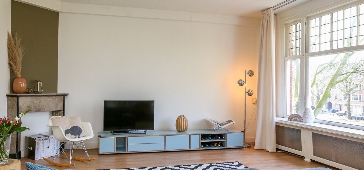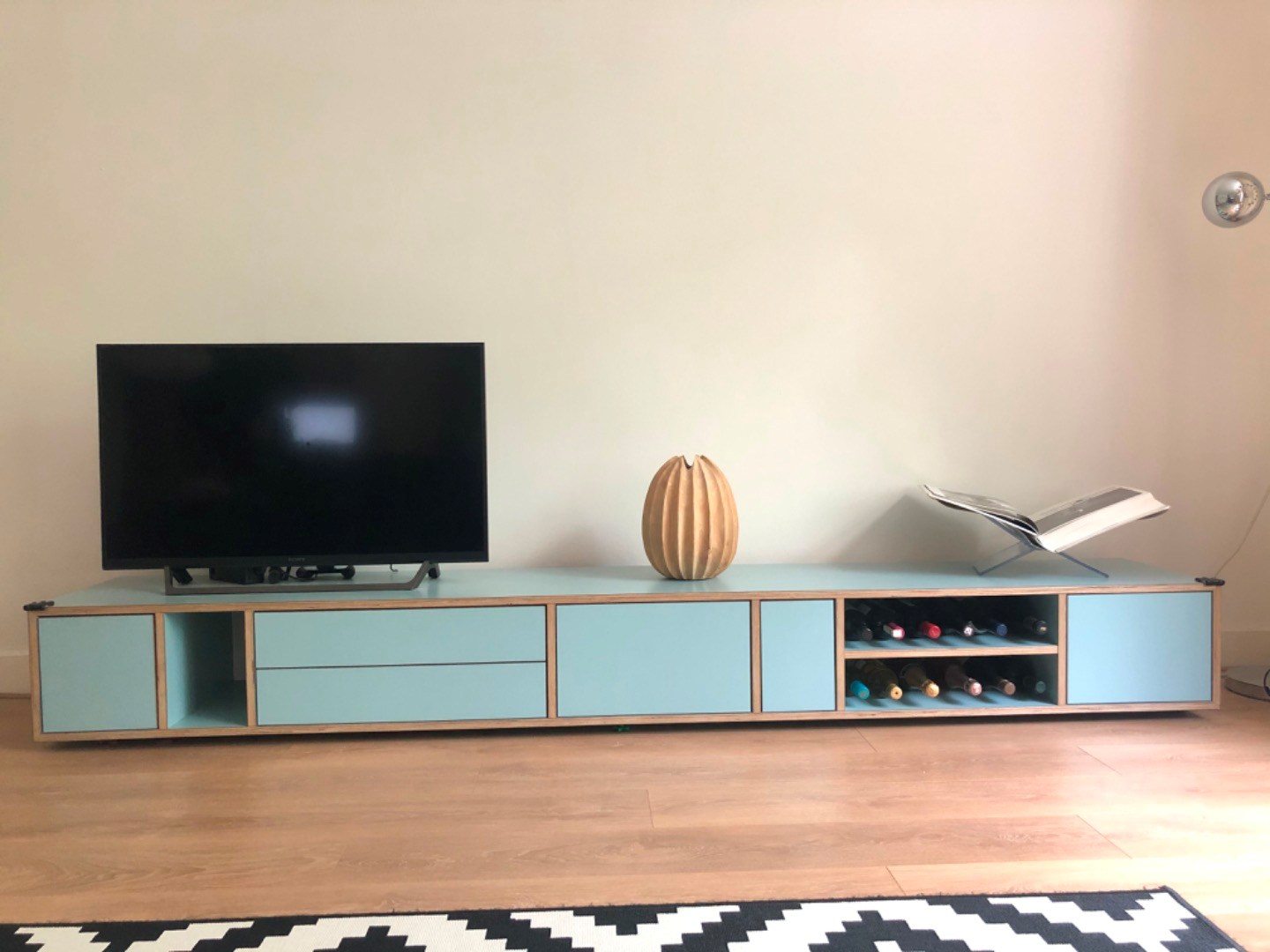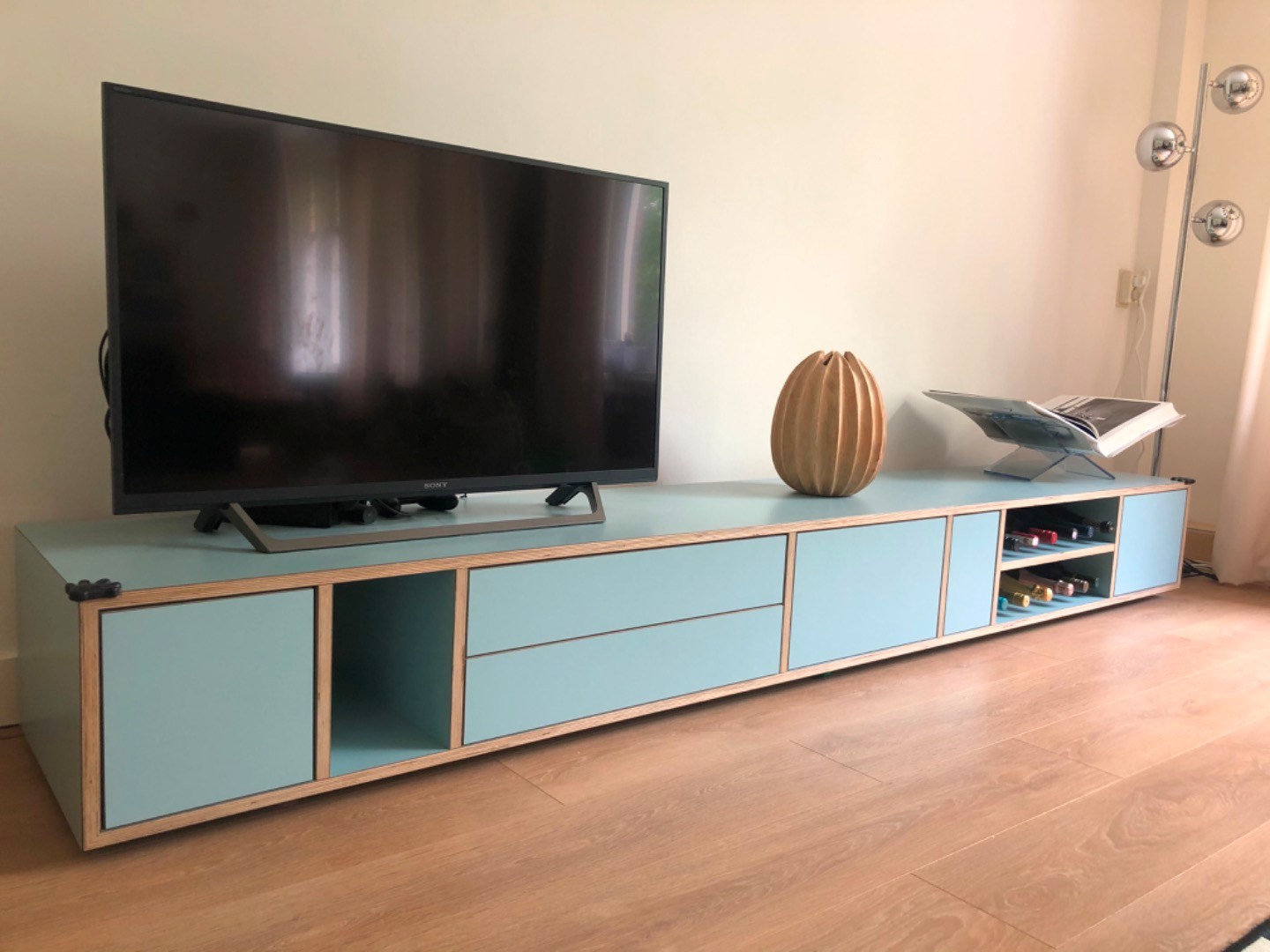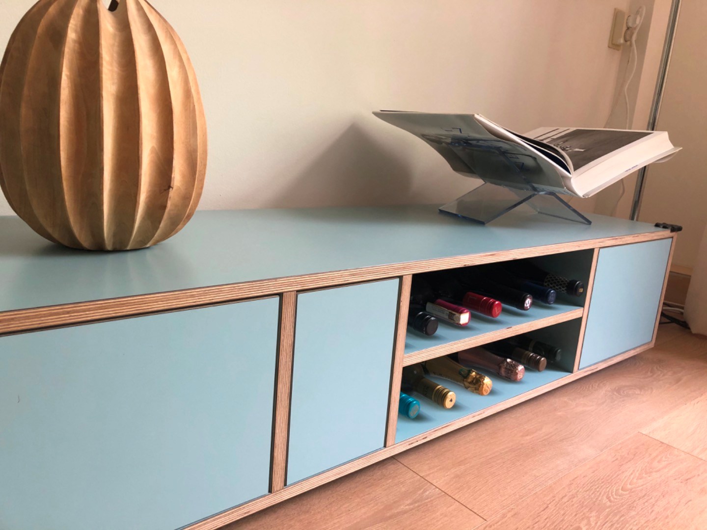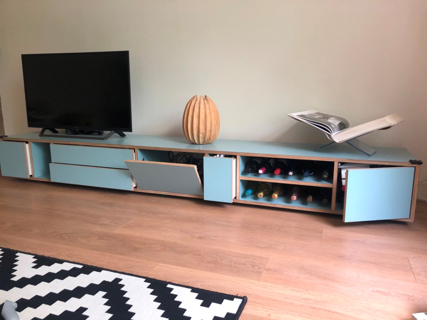 Mooi en stijlvol design dressoir (plateau) ontworpen door ontwerpbureau Depot Rotterdam. Het dressoir is 270 cm breed, 45 cm diep en 32,5 cm hoog. Zoals op foto 5 te zien is, bevat het dressoir aardig wat opbergruimte met twee hoge en twee lage (brede) laden, drie open vakken, een deurtje en in het midden een klep. Het dressoir is aan de achterkant van het vak met de klep open, zodat de kast ook goed als tv-kast te gebruiken is. Het dressoir heeft een mooie lichtblauwe/ turquoise kleur gecombineerd met randen met een lichte houtkleur. Het dressoir ziet er nog erg goed uit. Vanwege een verhuizing moeten wij er helaas afstand van doen. Nieuwprijs: 1950 euro.