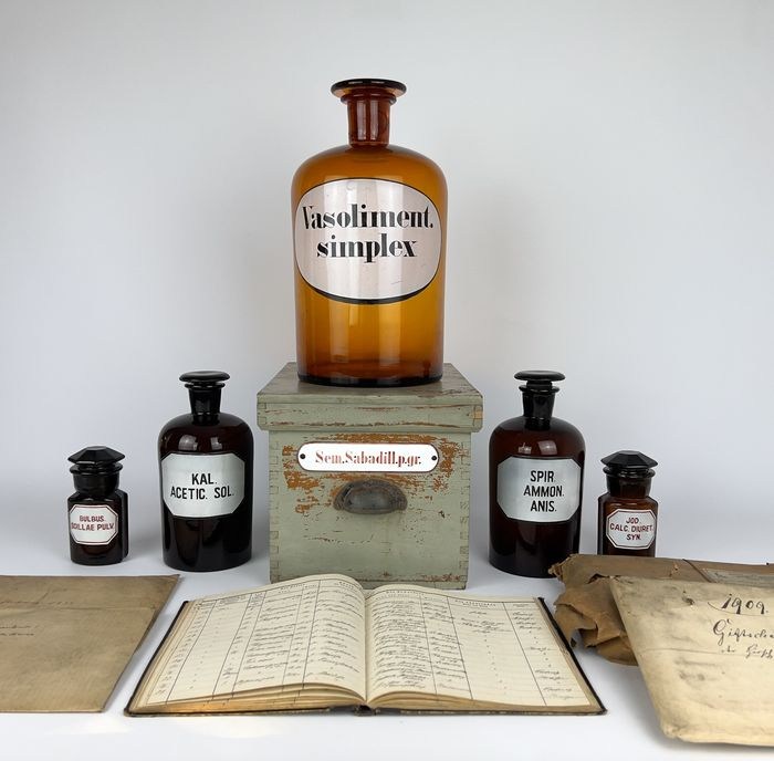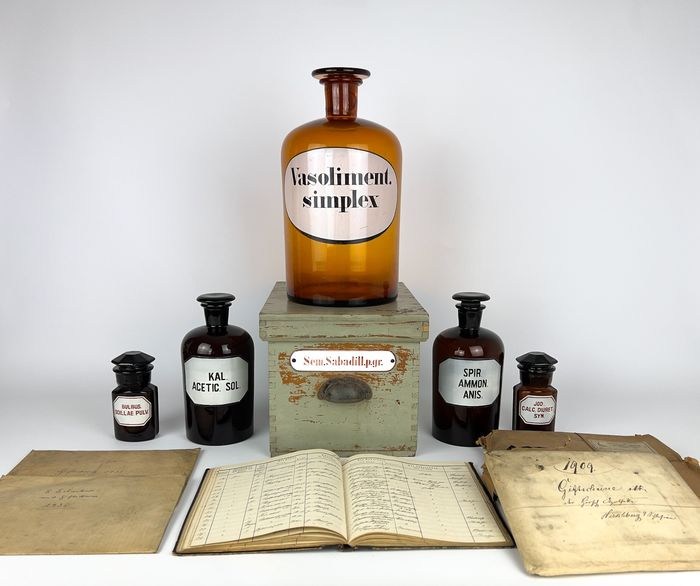 De items zijn afkomstig uit het Pruisische ''O. Handke'' apotheek die werd geplaatst in de stad Hirschberg aan de straat Bahnhof 17 (tegenwoordig de Poolse stad Jelenia Góra aan de straat Maja 1go).