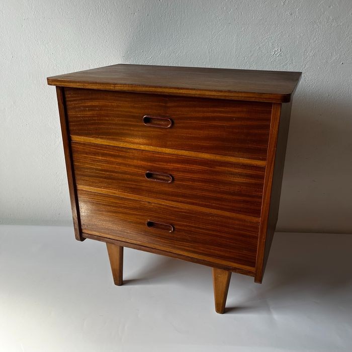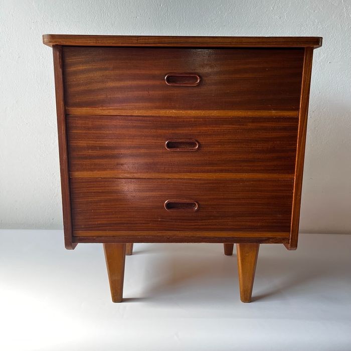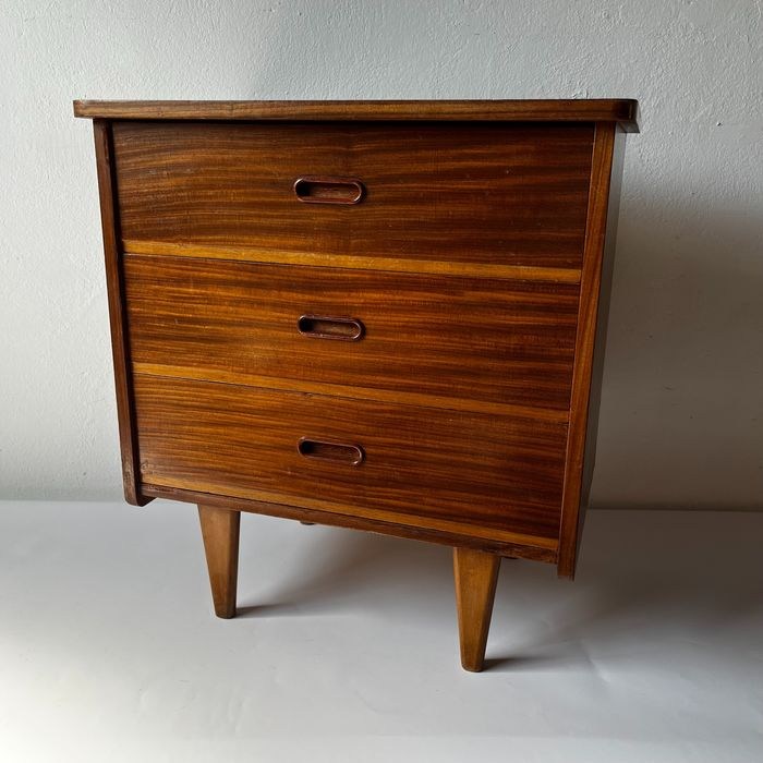 Het kastje heeft drie lades en staat op taps toe lopende poten.