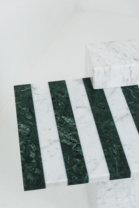 Een daarvan is het witte Carrara-marmer met een glanzende afwerking (het beste marmer om Italië te vertegenwoordigen) dat werd gebruikt om de basis te maken met een heel blok van 12 cm en ook werd gebruikt om de bovenkant te creëren samen met een prachtig glanzend Guatemala-groen marmer met zijn fantastische aderen.